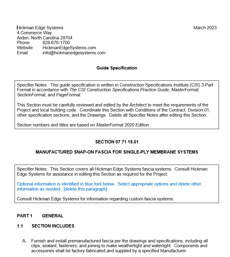 Division 7 CSI Specification Guide: Snap-on Fascia for Single-Ply Membrane Systems
