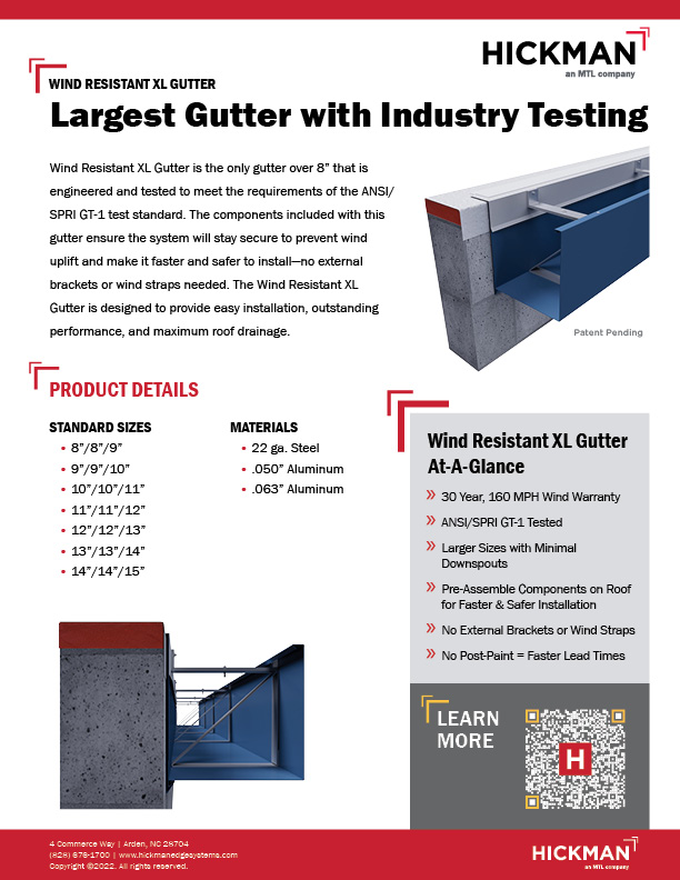 Wind Resistant XL Gutter is the largest gutter system that is engineered and tested to meet the requirements of the ANSI/SPRI GT-1 Standard for Gutter Systems Used with Low-Slope Roofs. This innovative gutter system incorporates a 2-in. wide, heavy-gauge aluminum z-bracket and a lower mounting hanger to ensure the system stays secured to prevent wind uplift—no external brackets or wind straps needed. (Patent Pending) Wind Resistant XL Gutter Highlights: • 30 Year, 160 MPH Wind Warranty • ANSI/SPRI GT-1 Tested • Larger Sizes with Minimal Downspouts • Pre-Assemble Components on Roof for Faster & Safer Installation Process • No External Brackets or Wind Straps • No Post-Paint=Faster Lead Times
