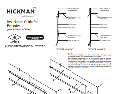 Hickman Edge Systems Extenders are easy to install, and consist of a 24 Ga. galvanized continuous cleat and a formed fascia extender. Our Extenders are available in 12-ft. lengths and with a variety of face heights to accommodate most requirements.
